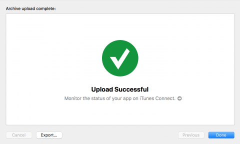 Ứng dụng của bạn sẽ bắt đầu tải lên iTunes Connect. Khi quá trình tải lên kết thúc, bạn sẽ thấy thông báo sau: