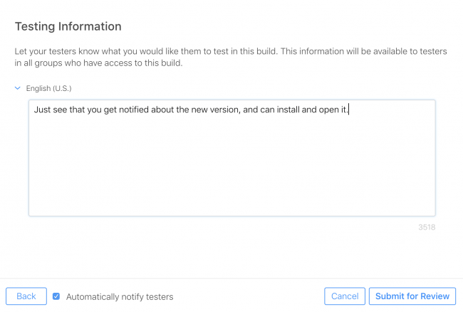 chọn Automatically notify testers nếu bạn muốn nó gửi noti cho các tester.