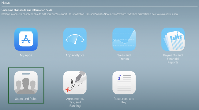Để thêm một người kiểm tra nội bộ, hãy đi tới phần Users and Roles trong iTunes Connect: