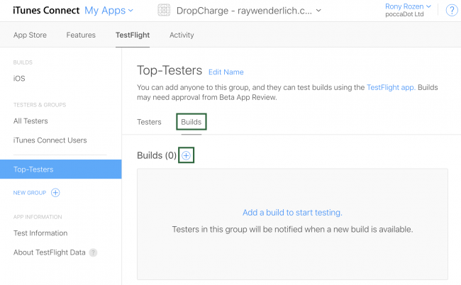 Mặt khác, người kiểm tra nội bộ sẽ được thông báo ngay lập tức về các bản dựng mới ngay khi chúng được tải lên và xử lý trong iTunes Connect. Bạn sẽ tìm hiểu thêm về những người thử nghiệm bên ngoài sau, hiện tại bạn sẽ tập trung vào những người thử nghiệm nội bộ.