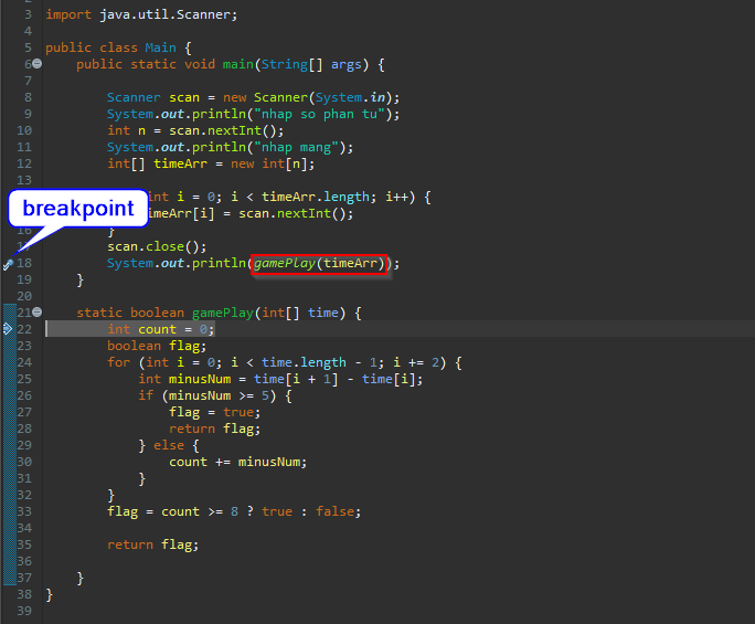 - Step Into (F5) - Thao tác này đi vào bên trong các phương thức được sử dụng trong dòng hiện tại (nếu có); còn không thì nó nhảy tới dòng tiếp theo. Trong ví dụ này, nó sẽ debug vào bên trong phương thức gamePlay ().