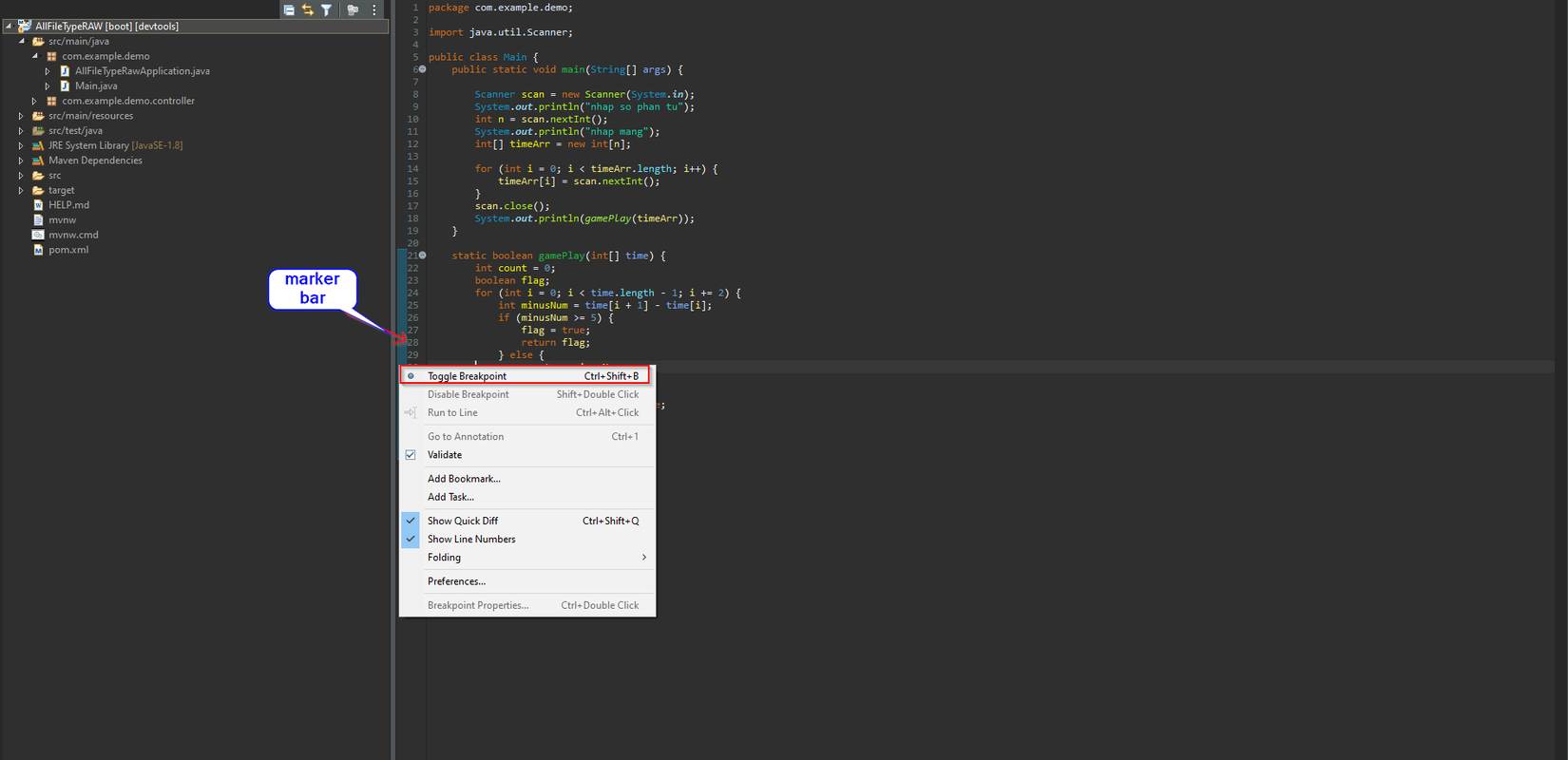 - Chuột phải vào marker bar, chọn Toggle Breakpoint