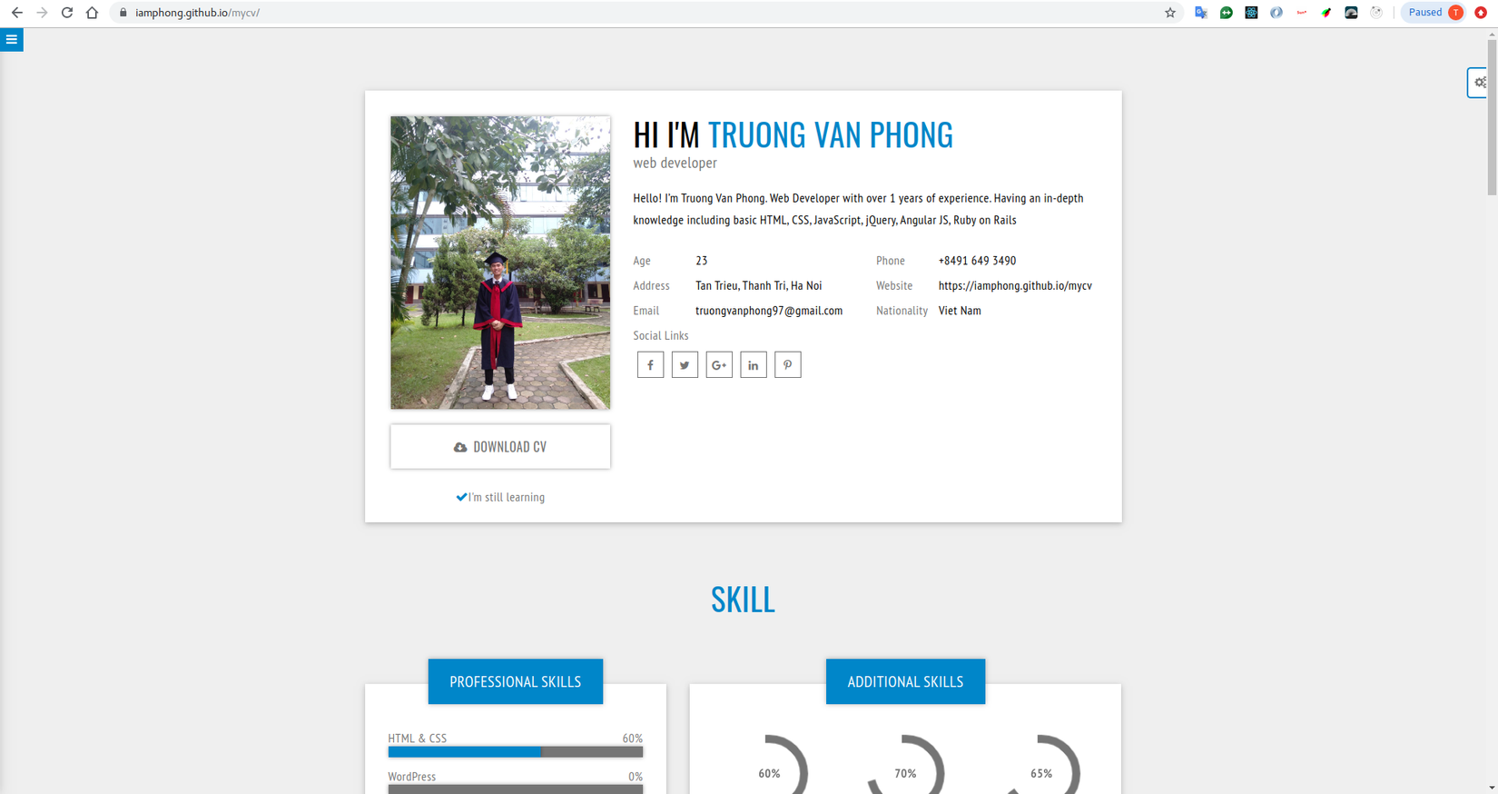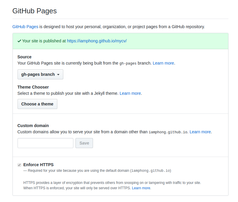 http://{username}.github.io/{repo-name}, username là user đang nhập github, repo-name là tên repo vừa tạo, ở đây của mình là mycv.