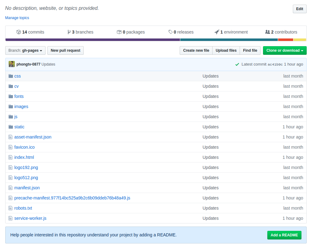 Ở đây ta thấy tất cả code ở nhánh master sẽ được complie hết lại thành các file và folder để github page có thể hiểu được, do đó sau này chỉ cần merged code vào master và tiến hành deploy bằng câu lệnh yarn run thì branch gh-pages sẽ được update lại.