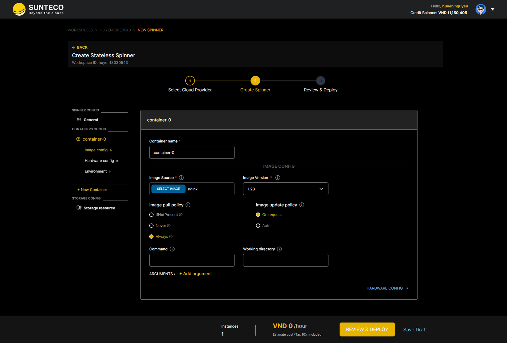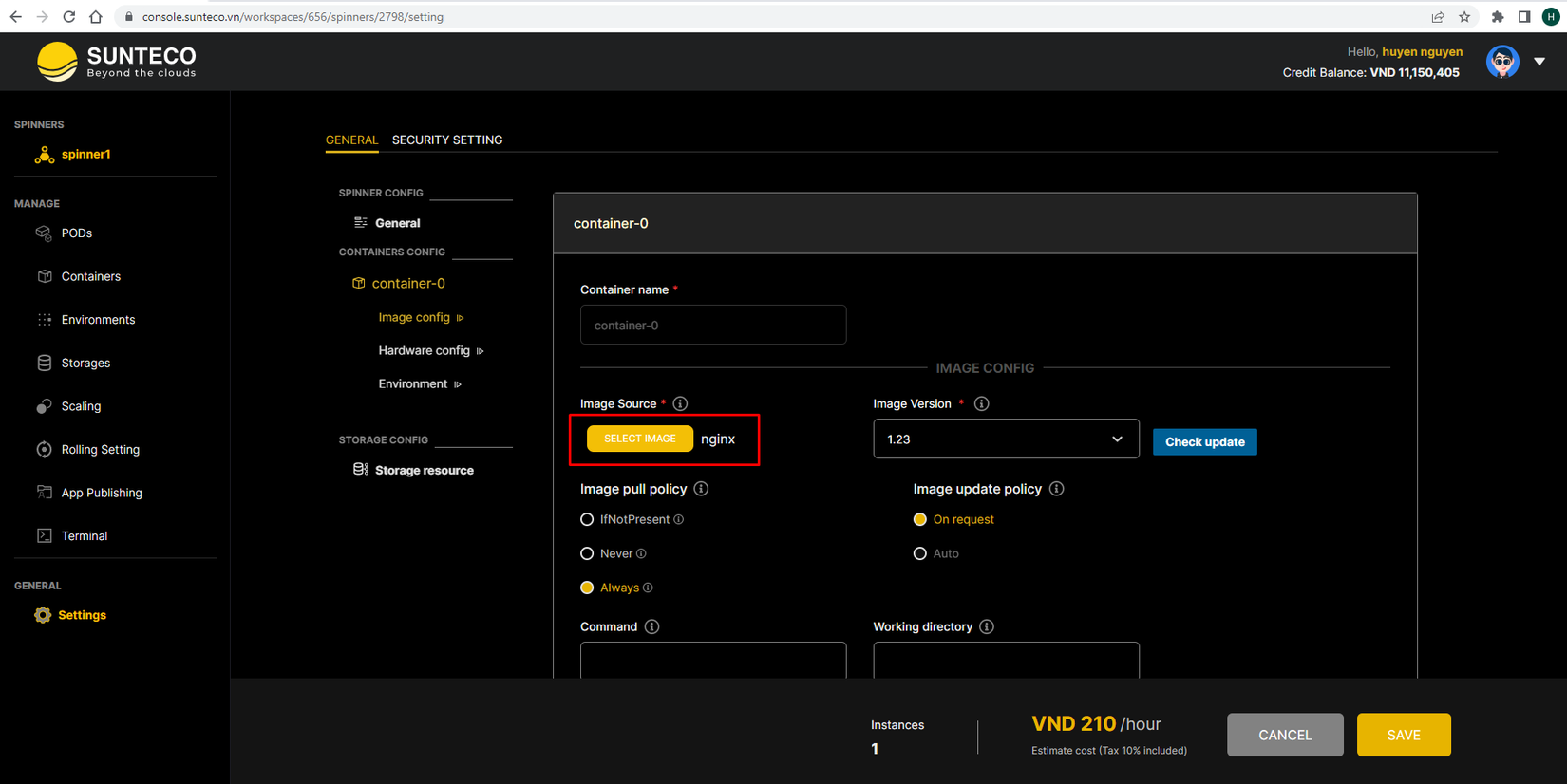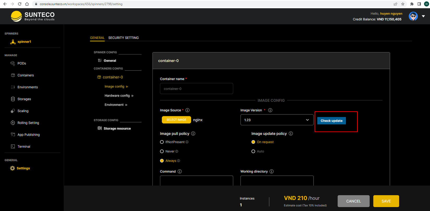 Hướng dẫn deploy spinner container trên hệ thống Sunteco Cloud