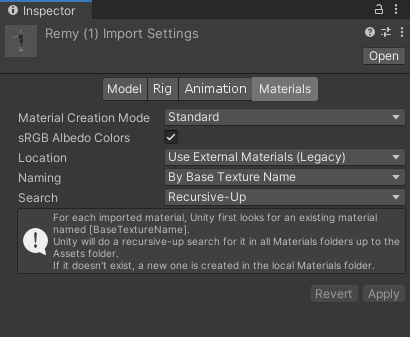 - Để khác phục tình trạng này các bạn ấn vào model trong phần Project, rồi chọn tab Materials, ở phần Location các bạn đổi từ Use Embedded Materials thành Use External Materials (Legacy) rồi ấn Apply.