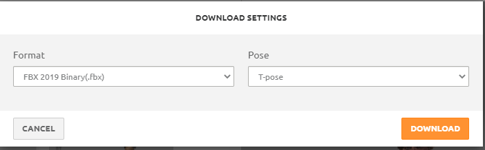 - Các bạn chọn Format là FBX 2019 Binary (.fbx) và Pose là T-pose, sau đó ấn Download trên popup.