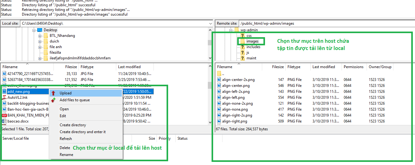 - Chọn file cần update dưới local và thư mục chứa trên host để tải tập tin: