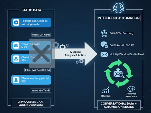 Nếu chỉ lưu trữ mà không xử lý, dữ liệu hội thoại là “dead data”. Nhưng khi được trích xuất và xử lý theo ngữ cảnh, chúng trở thành business trigger có thể kích hoạt tự động quy trình thực từ tạo đơn, gửi mail xác nhận đến mở phiếu hỗ trợ.