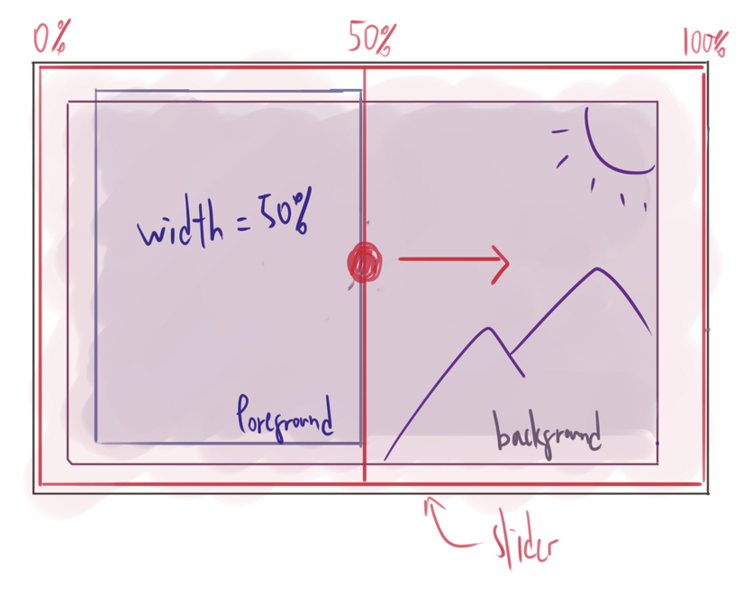 Chúng ta sẽ tạo ra thanh trượt với chiều rộng là 100% và chiều cao là chiều cao của container và đặt nó lên trong image containter. Khi người dùng kéo thanh trượt, thì cập nhật chiều rộng của foreground cùng lúc đó. Khi đó tạo ảo giác người dùng đang kéo hình ảnh.