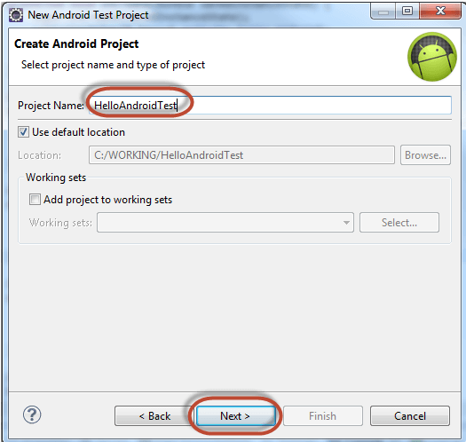 Viết tên dự án thử nghiệm của bạn. Theo quy ước đặt tên, dự án thử nghiệm của bạn phải có tên "HelloAndroidTest"