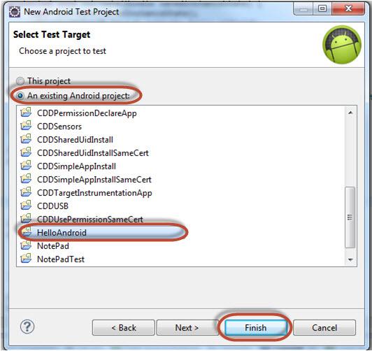 Chọn ứng dụng mục tiêu đang thử nghiệm. Trong trường hợp này là HelloAndroid. Sau đó nhấn vào Finish.