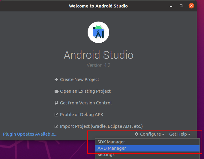 Cũng tương tự như với cài đặt SDK, bạn hãy vào Configure lựa chọn AVD Manager.