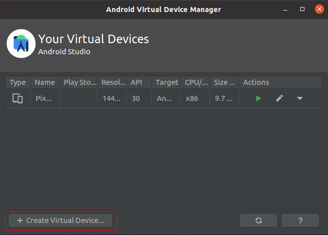 Giao diện AVD Manager sẽ hiện ra, sau đó hãy chọn Create Virtual Device... đối với trường hợp lần đầu, chưa có máy ảo đã tạo trước đó.