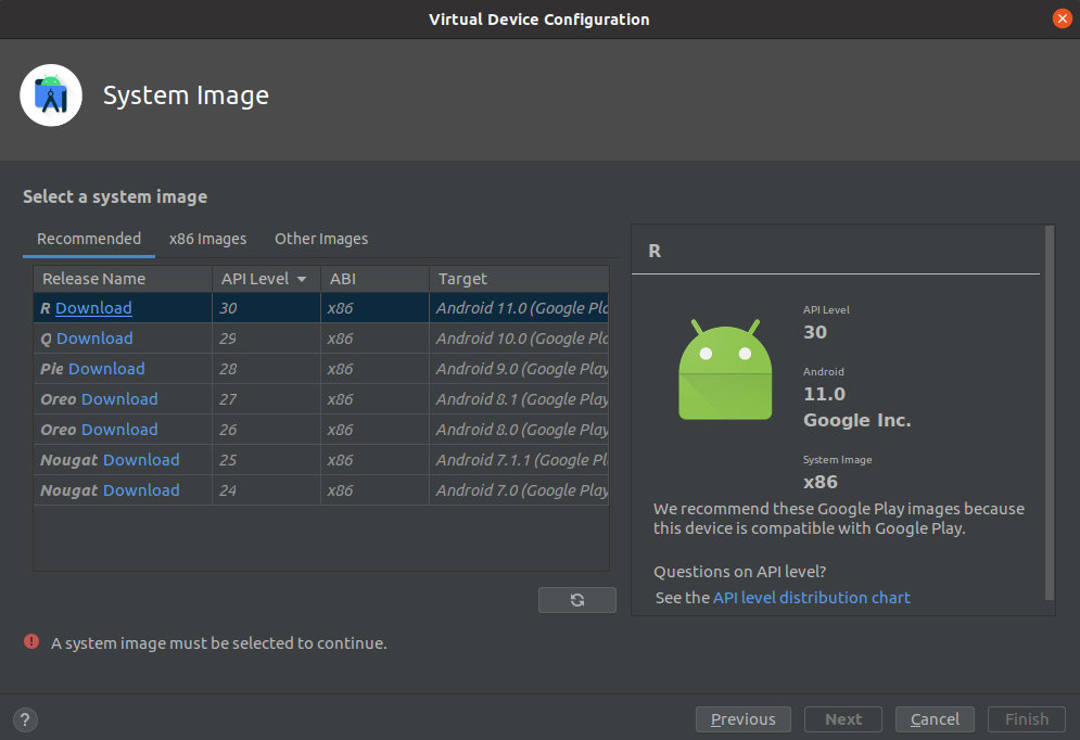 Lựa chọn system image cho thiết bị. Nếu lựa chọn của bạn chưa được Down, hãy chọn Download tương ứng với từng dòng trong bảng system image