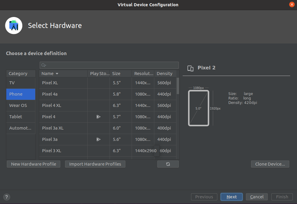 Lựa chọn thiết bị cũng như kích cỡ màn hình mà bạn muốn tạo máy ảo. Sau đó chọn Next.