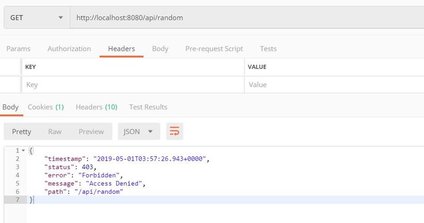 Khi server on, chúng ta request thử tới địa chỉ http://localhost:8080/api/random mà không xác thực.