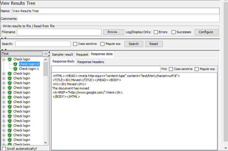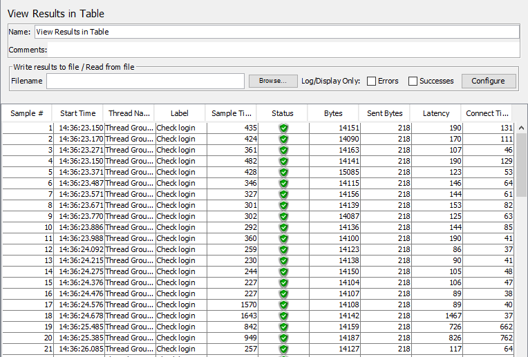 View Results Tree: Báo cáo chi tiết kết quả thực hiện của từng request. Tại đây ta có thể xem lại dữ liệu request đó đã gửi đi, và dữ liệu nhận được từ phía server. View Results in Table: Chi tiết kết quả thực hiện từng request ở dạng bảng. (Chi tiết của dạng summary report) Graph Results: Biểu đồ thống kê thời gian phản hồi và các tham số sau mỗi request được gửi đi.