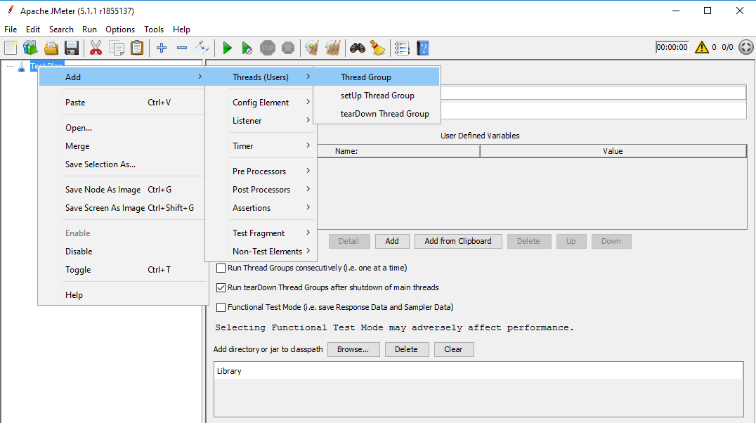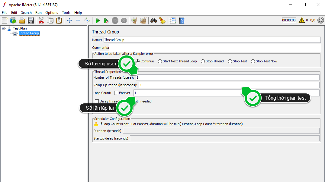 Số lượng Thread: Mỗi Thread đại diện cho một người dùng ảo, JMeter cho phép thay đổi số lượng người dùng không hạn chế để thực hiện các thử nghiệm. Ram-Up Period: Thời gian để bắt đầu tất cả những Thread. Loop Count: Số lần lặp lại những yêu cầu của người dùng. Ngoài ra còn có những tùy chọn khác như việc chạy các Thread vào lịch biểu định sẵn, xác định hành động sẽ thực hiện khi xảy ra lỗi…