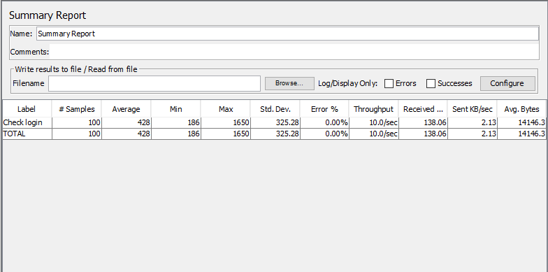 Label: Tên http request Sample: số lượng request đã thực hiện Avarage: Thời gian phản hồi trung bình. Đơn vị ms. Min: Thời gian phản hồi ngắn nhất; Max: Thời gian phản hồi lâu nhất Std. Dev: Độ lêch chuẩn thời gian phản hồi Error %: Tỉ lệ % số request bị lỗi (Không nhận được phản hồi từ server). Throughput: Số request server có thể xử lý/ second/minute/hour. Received KB/sec: Thông lượng KB nhận được/giây Sent KB/sec: Thông lượng KB gửi đi/giây Avg. Bytes: Dữ liệu phản hồi trung bình