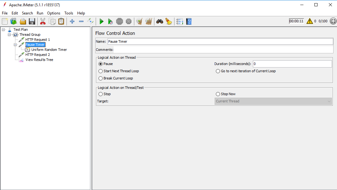 Timer Timer là một phần rất quan trọng khi xây dựng một Test Plan, nó cho phép cài đặt khoảng thời gian giữa 2 yêu cầu kế tiếp nhau mà người dùng ảo gửi đến máy chủ. Điều này sẽ tạo ra một mô phỏng thực tế nhất so với hoạt động thực tế của người dùng trên website. JMeter cung cấp nhiều Timer với các dạng khác nhau để thiết lập thời gian nghỉ giữa việc thực hiện 2 yêu cầu , như : • Constant Timer: xác lập thời gian là một hằng số. • Uniform Random Timer: xác lập thời gian nghỉ ở một khoảng xác định. Để sử dụng Timer, ta tạo 1 Flow control action và đặt timer vào trong Follow đó.