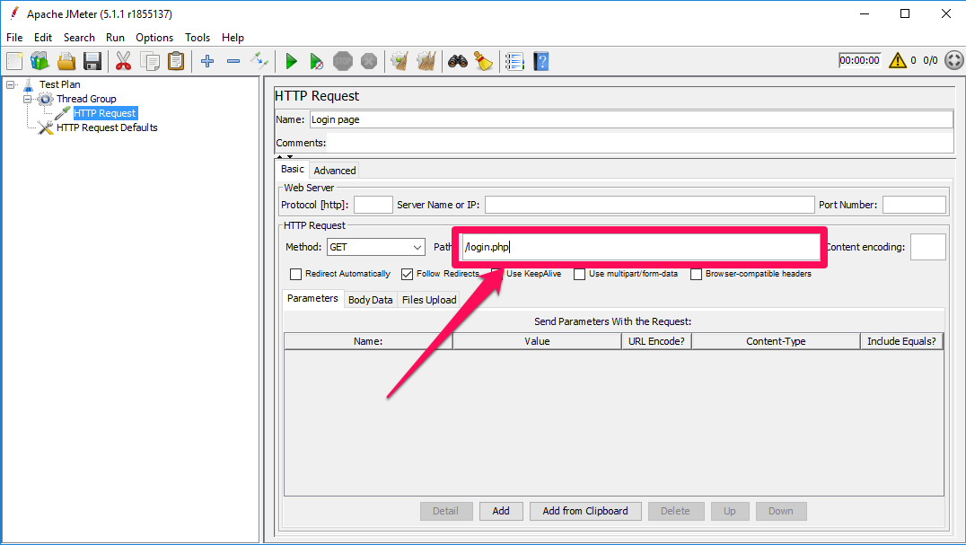 Trong Bảng HTTP Request, trường Path cho biết yêu cầu URL nào bạn muốn gửi tới server. Nếu bạn để trống trường này, request sẽ được gửi tới URL: google.com (Đã được config trước đó ở http request default) Ở đây ta còn có thể định nghĩa phương thức truy cập tới URL trên gồm: GET/POST/HEAD/PUT/DELETE/…. Phổ biến nhất hay dùng là GET/POST. Để truyền thêm param cho request, ấn nút Add.
