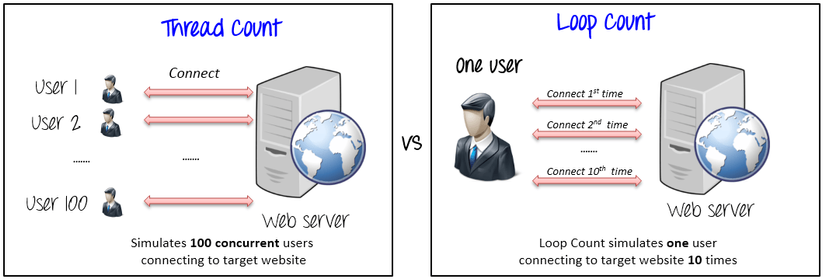 Chú ý: 100 user + Loop count: 1 khác gì 50 user + Loop count 2. Về tổng số request thì bằng nhau, Jmeter sẽ thực hiện 100 lượt test. Tuy nhiên có sự khác nhau về thứ tự thực hiện của các user như sau: