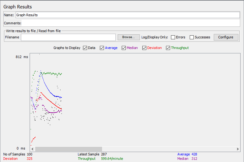 Ở dưới cùng của hình ảnh, có các số liệu thống kê sau đây, được biểu thị bằng màu sắc: • Đen: Tổng số mẫu hiện tại được gửi – 100. • Màu xanh dương : Mức trung bình hiện tại của tất cả các mẫu được gửi – 428ms. • Màu đỏ : Độ lệch chuẩn hiện tại – 325ms. • Màu xanh lá cây : Tỷ lệ thông lượng biểu thị số lượng yêu cầu mỗi phút mà máy chủ xử lý. – 59 964 request/phút 1 vài chú ý: Throughput càng cao càng tốt. Chứng tỏ server xử lý được nhiều request/thời gian. Nó biểu hiện cho khả năng máy chủ xử lý tải nặng. Throughput càng cao thì hiệu suất máy chủ càng tốt Deviation: Tham số Deviation được hiện màu đỏ, nó chỉ ra sai lệch so với mức trung bình. Giá trị Deviation càng nhỏ thì càng tốt.
