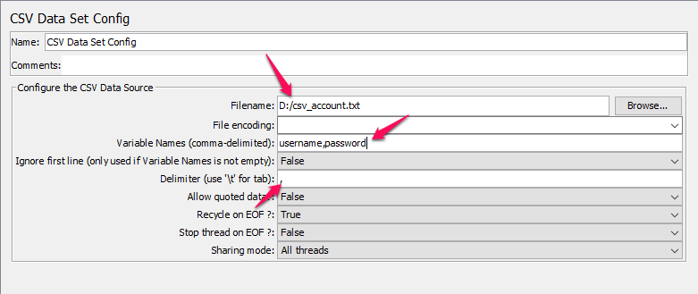 Giải thích CSV data Filename: đường dẫn tới file dữ liệu Varible names: Tên các biến mình định nghĩa, theo thứ tự dữ liệu từ trái qua phải Delimiter: Kí tự dùng để phân cách giá trị các biến. Theo như file csv_account.txt bên trên thì mình định nghĩa format dữ liệu sẽ là: username, password. Để sử dụng các giá trị từ file dữ liệu đưa vào http request, cấu hình như sau: