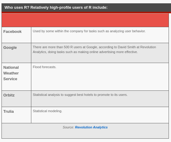 “Tôi có thể viết một phần mềm chuyên nghiệp bằng nhiều chương trình, trong đó ngôn ngữ R là ngôn ngữ khó học nhất.” Cố vấn John D.Cook chia sẻ trên một trang web về ngôn ngữ lập trình R cho những ai đang học ngôn ngữ khác chuyển qua học ngôn ngữ R. “Ngôn ngữ này thật sự khá đơn giản nhưng thật sự không tiện lợi.”