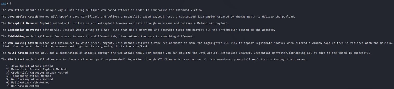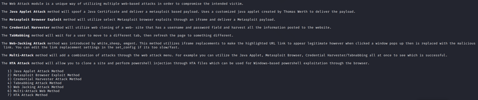 Tiếp đó lựa chọn phương thức 1) Web Templates (Nếu website bạn muốn phishing là Facebook, Google, Amazon)