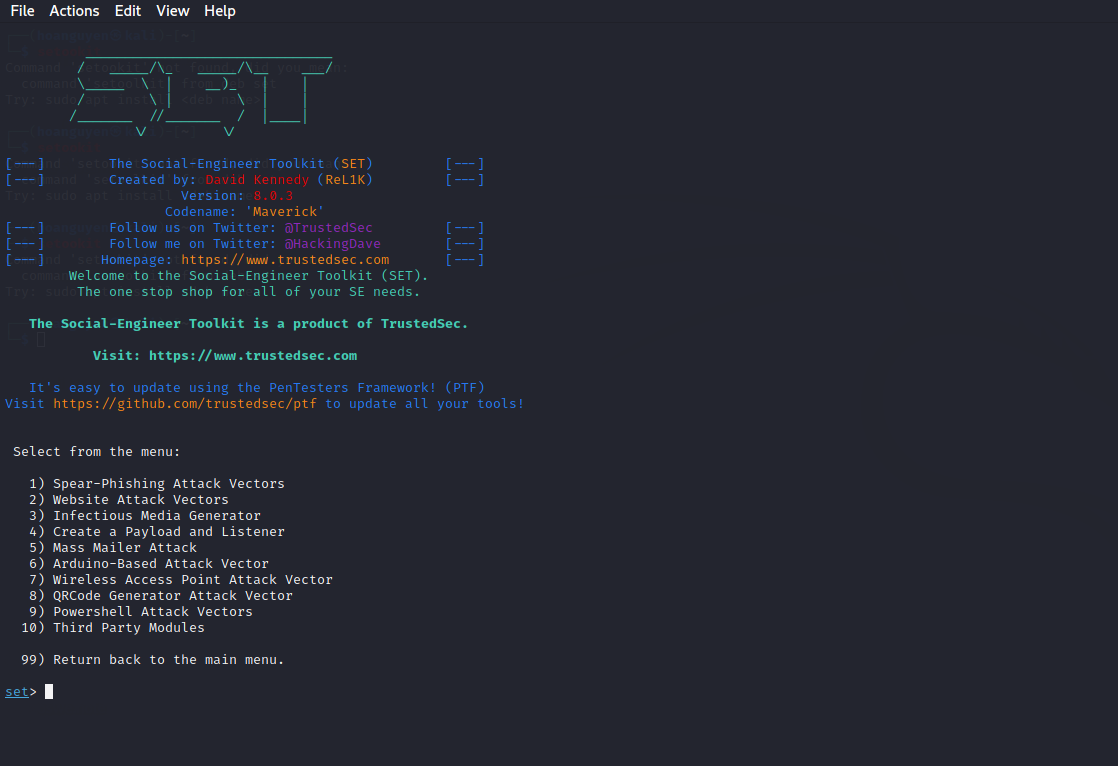 Phần demo dưới đây, mình sử dụng bộ công cụ tấn công Setoolkit . Đây là một công cụ rất nổi tiếng , chuyên biệt dành cho dạng tấn công này.
