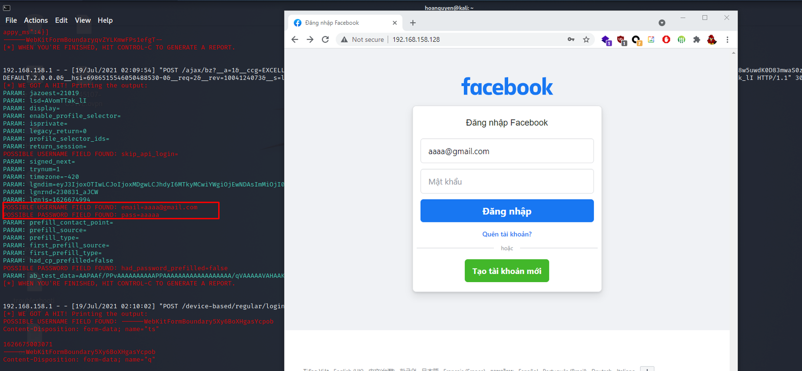 Vậy là xong, khi người dùng truy cập vào website của bạn và nhập thông tin của họ. Setoolkit sẽ hiển thị ngay lập tức