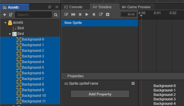 - Kéo toàn bộ các Frame trong file plist vào trong Timeline hàng spriteFrame.