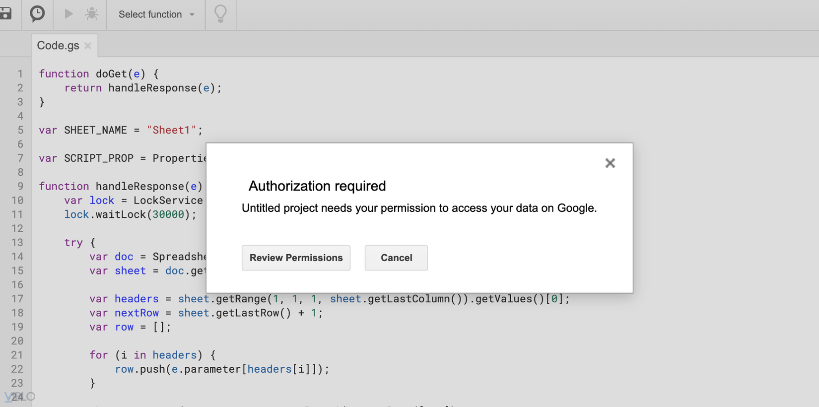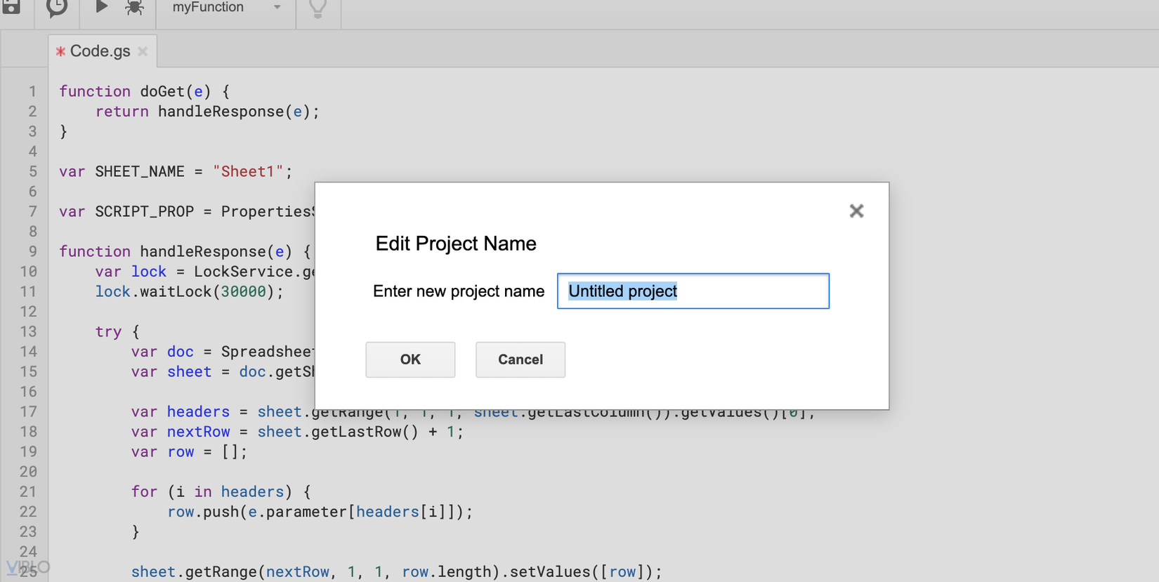 Thay đoạn code trong phần Code.gs thành nội dung sau