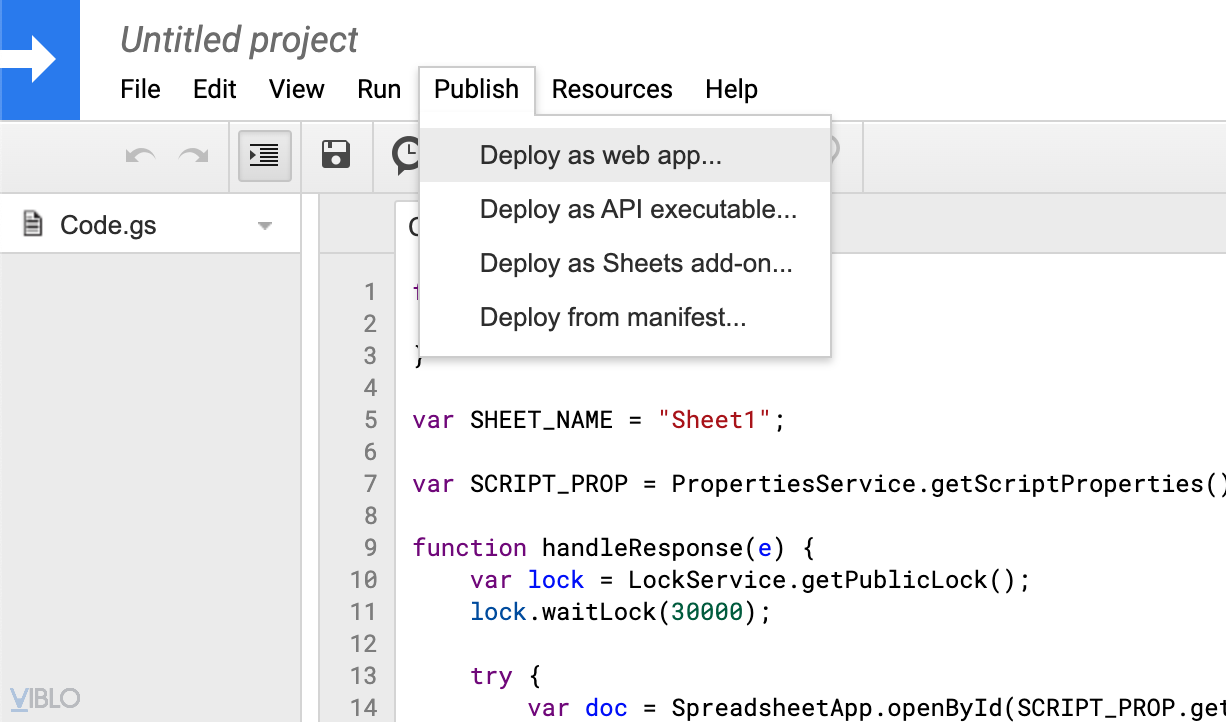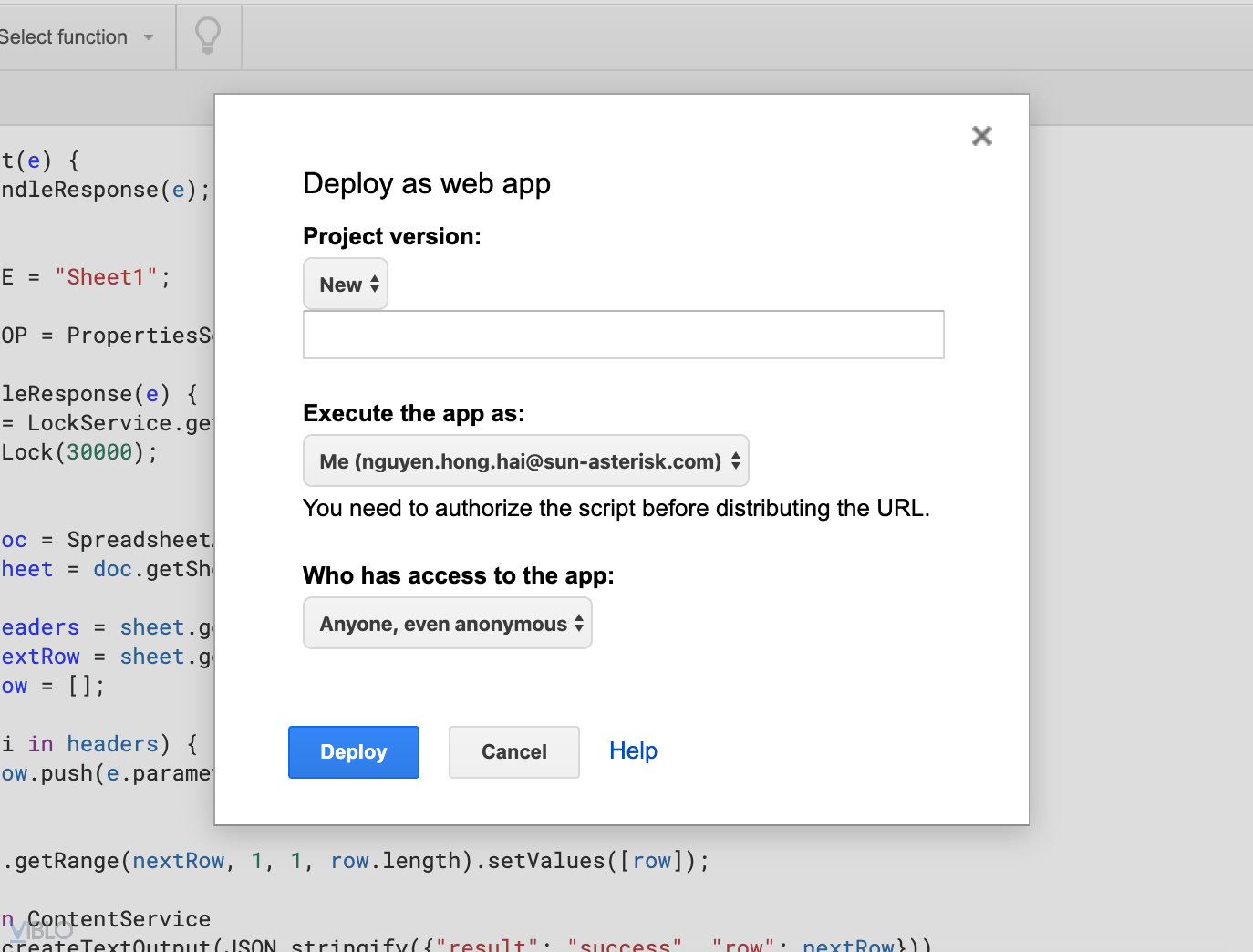 Sau khi đã cấp quyền cho tài khoản bước tiếp theo chúng ta sẽ thực hiện lấy URL, chọn Publish -> Deploy as web app