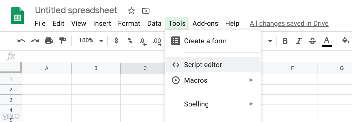 Sau khi đã có 1 trang google sheet chúng ta sẽ đi viết script để ghi dữ liệu, trên thanh công cụ chọn Tools -> Script editor