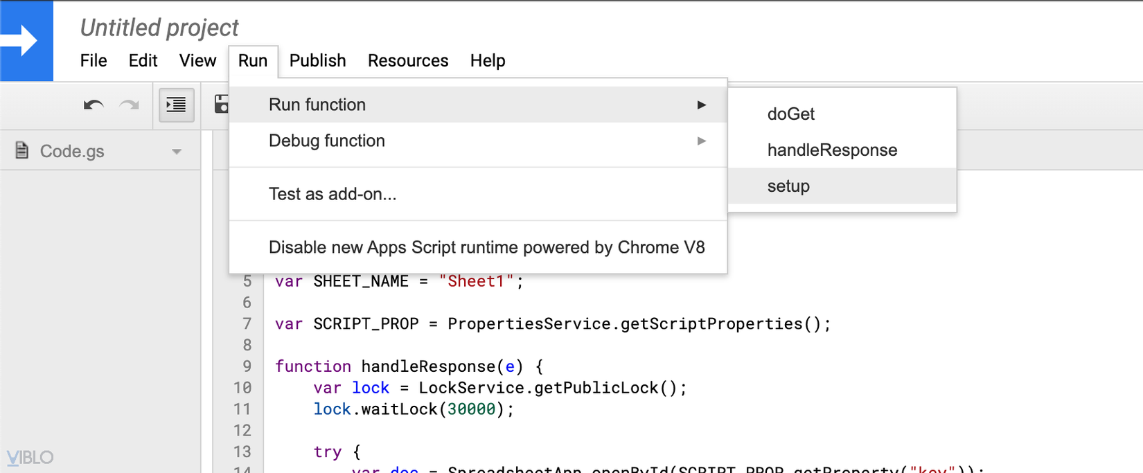 Bước tiếp theo cần cấp quyền cho google script sử dụng tài khoản, chọn Run -> Run function -> setup