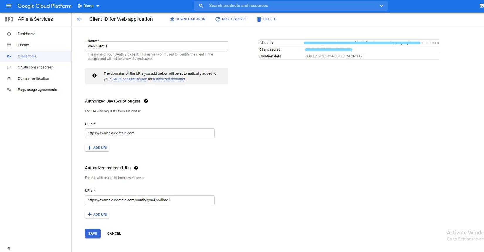 - Authorized redirect URIs: url này để google redirect về website của chúng ta và tạo token file. Ví dụ chúng ta có domain name là domain.com thì sẽ là: https://domain.com/oauth/gmail/callback