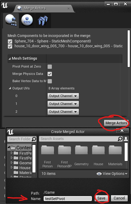 - Các bạn thao tác theo các bước sau: Window -> Developer Tools -> Merge Actors -> Chọn Object -> Chọn Model -> Ấn Merge -> chọn vị trí lưu và đặt tên cho Model mới.