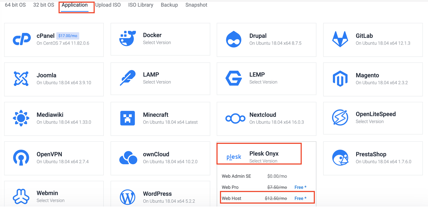 - Server Type: Click sang tab Application chọn Plesk Onyx -> Tiếp theo chọn phiên bản sẽ sử dụng: ví dụ mình đã chọn Web Host version, xem hình dưới
