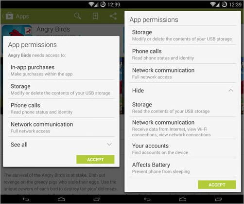 - Khi một ứng dụng được tải xuống từ Cửa hàng Play (CH Play) và được cài đặt, có thể một file log sẽ được tạo cùng. Khi ứng dụng được tải xuống và cài đặt, việc xác minh tài khoản Google hoặc iTunes được thực hiện. Do đó, sẽ có nguy cơ thông tin đăng nhập của bạn sẽ rơi vào tay tin tặc.
