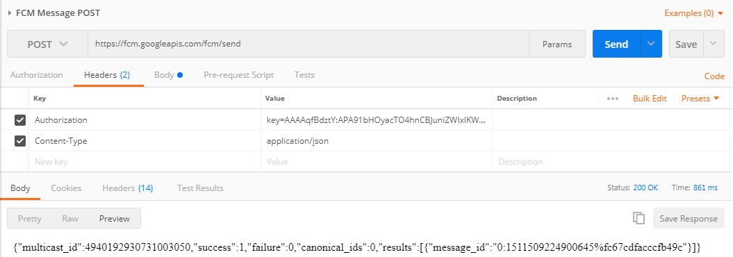 Trong phần Header Authorization: key=<server_key> server_key lấy từ firebase ở trên. và thêm Content-Type: application/json.