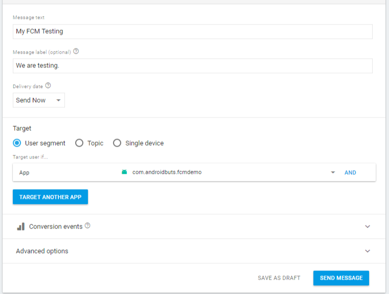 Notification Message: FCM tự động hiển thị thông báo cho các thiết bị người dùng cuối thay mặt cho ứng dụng khách. Tin nhắn thông báo có một tập hợp các khóa người dùng có thể nhìn thấy được xác định trước và một khối lượng dữ liệu tùy chọn của các cặp khóa-giá trị tùy chỉnh.