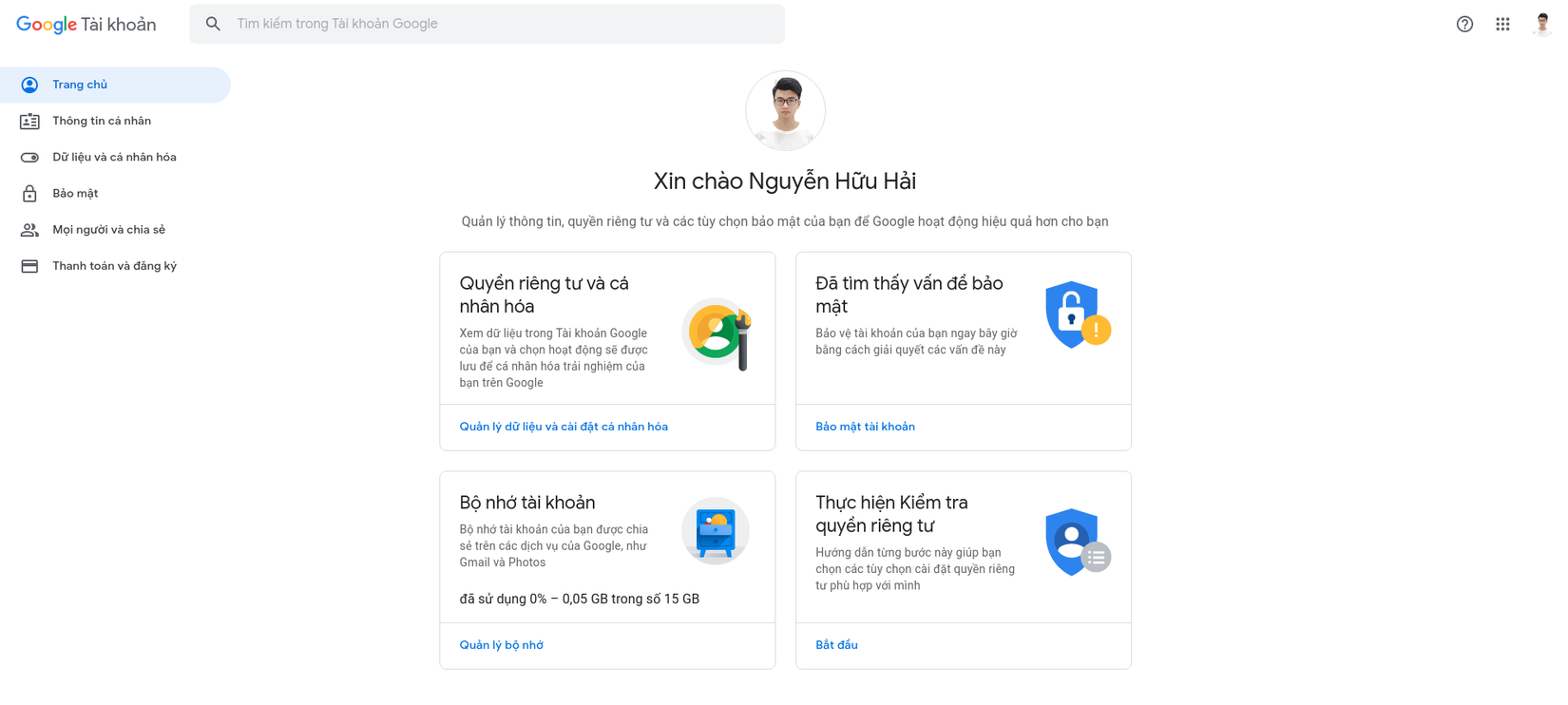 Đầu tiên, các bạn truy cập vào trang quản lí tài khoản của Google tại đây. Sau khi truy cập và đăng nhập bạn sẽ thấy màn hình sau: