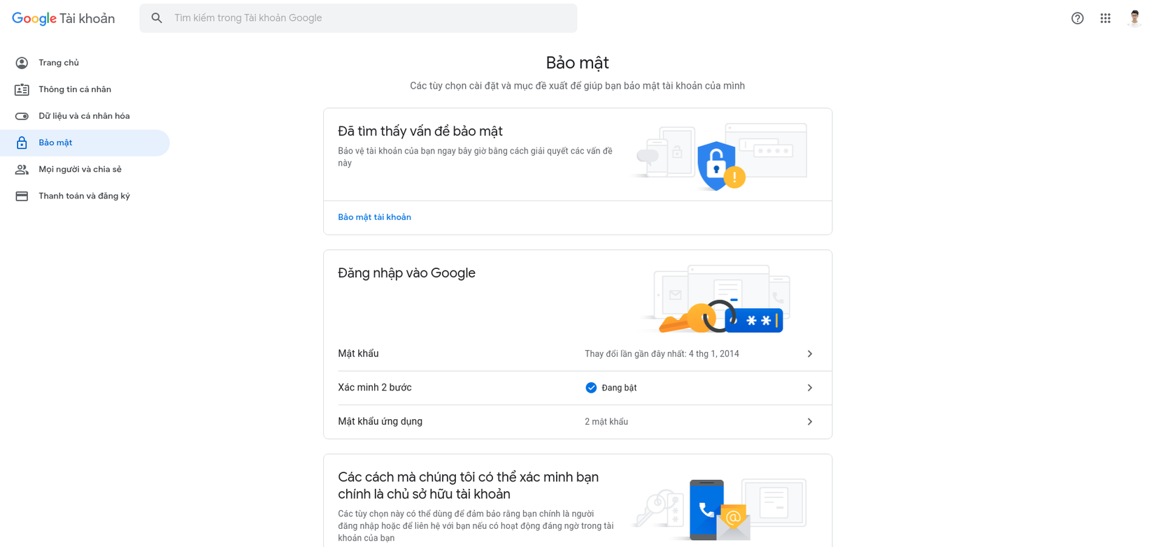 Tại đây, bạn có thể thấy phần Đăng nhập vào Google có phần Xác minh 2 bước đang bật, tức là tài khoản của bạn đang được bảo vệ với lớp bảo mật nâng cao.