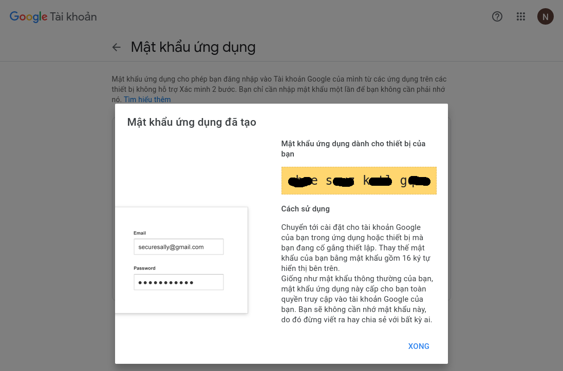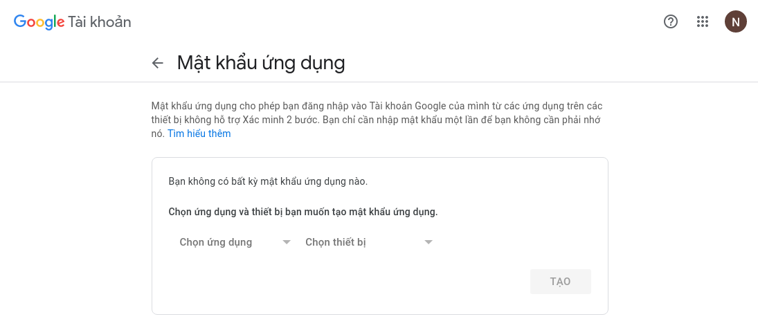Tiếp đến bạn chọn Mật khẩu ứng dụng, khi này Google sẽ yêu cầu bạn nhập lại mật khẩu một lần nữa. Sau khi nhập lại mật khẩu thì bạn sẽ thấy màn hình này.