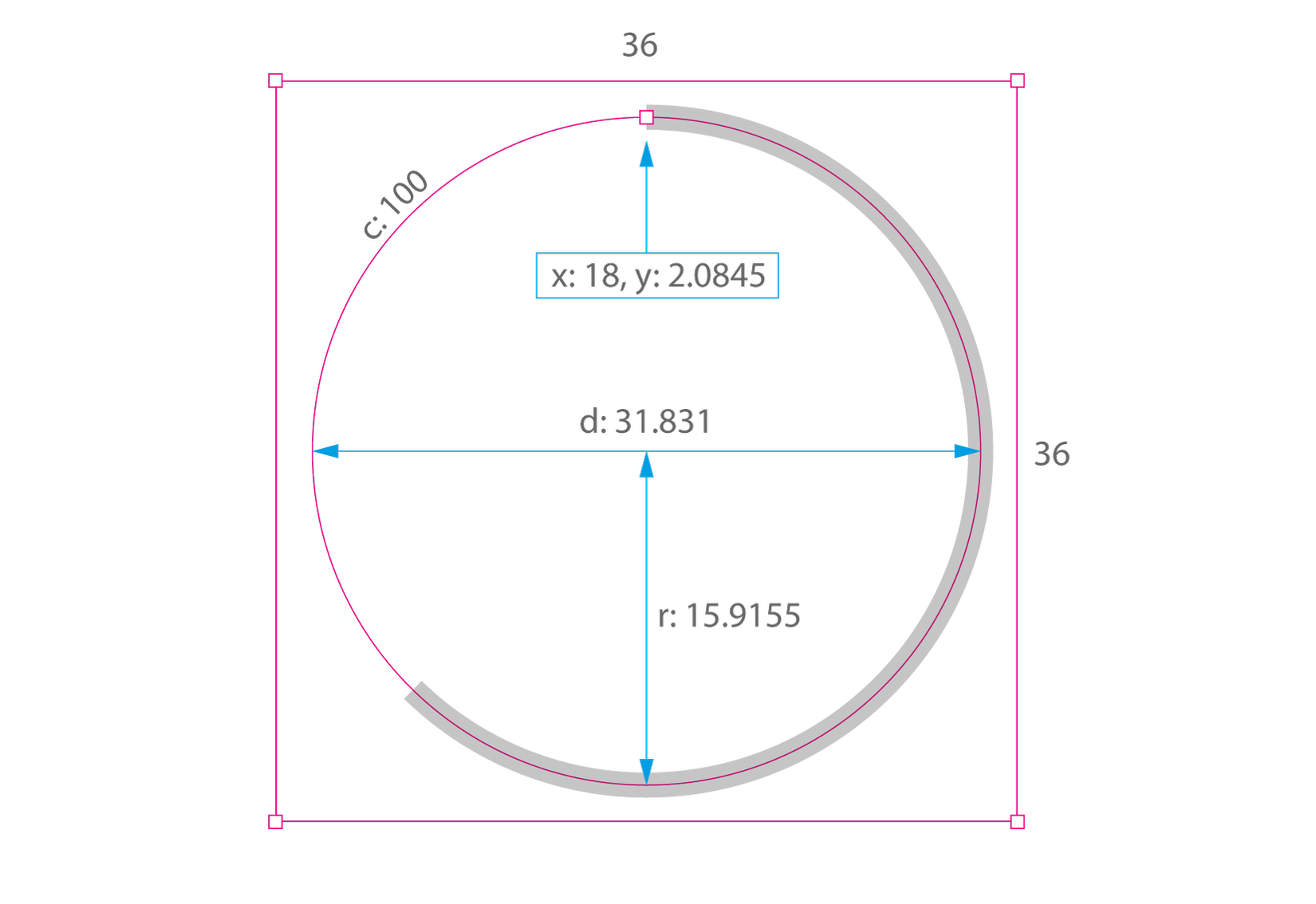 Đến đây, bạn đã vẽ được một đường tròn có đường kính là 31.831. Nếu bạn để ý kỹ hơn bằng cách mở developer tools của trình duyệt và inspect element thì bạn sẽ thấy có một vùng bao bọc cả đường tròn. Vì chúng ta sẽ có thể vẽ một đường tròn khác rộng và dày hơn bao quanh nó nên mình đã để vùng này to hơn đường tròn đã vẽ trước đó một chút với tỉ lệ là 36x36. Bên cạnh đó, điểm bắt đầu của đường tròn cũng được thiết lập với các giá trị như dưới đây: