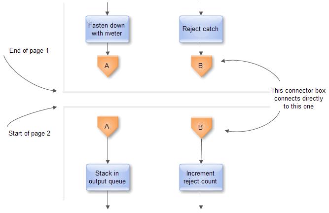 Quy trình trong biểu đồ flow thường đi sai xung quanh các decision, có thể là vì câu hỏi sai đang được hỏi hoặc do các câu trả lời sai được đưa ra. Trong trường hợp đó, các khối không thể kết nối trực tiếp được với các dòng, các dòng riêng biệt được phối hợp với các khối kết nối chứa các tên trùng khớp. Điều này thường xảy ra khi các dòng giao nhau trên 1 trang khác như hình minh họa.
