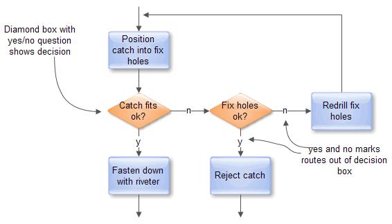 Các quy trình dần trở nên phức tạp hơn khi các decision (quyết định) được đưa, các action thay thế được đưa ra cho mỗi mũi tên. Các decision được thể hiện qua 1 khối hình hộp kim cương, trong đó chứa 1 câu hỏi đơn giản, và câu trả lời thường là "có" hoặc "không" như trong hình bên dưới. Các decision phức tạp hơn được tạo ra từ các decision đơn giản.
